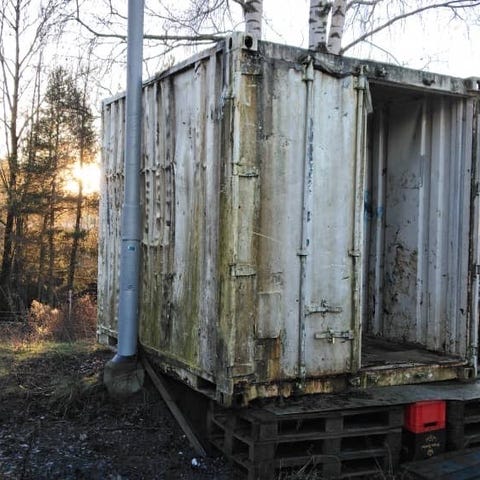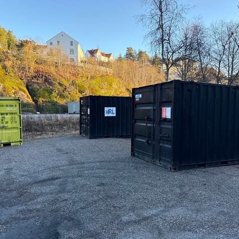 Gul container lagringscontainer med hyller og belysning. Egnet for lagring av ulike gjenstander og utstyr. Båre følger med