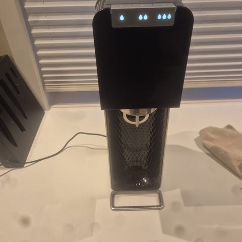 Maskinen har normale bruksspor, men er hel, ren og klar til bruk. Perfekt for deg som vil lage kullsyrevann hjemme på en enkel og rimelig måte.