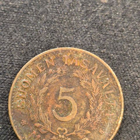 Suomen Tasavalta 5 Markkaa mynt fra 1948. Mynten har et klassisk design med riksvåpen på forsiden og verdien omgitt av laurbærkrans på baksiden.