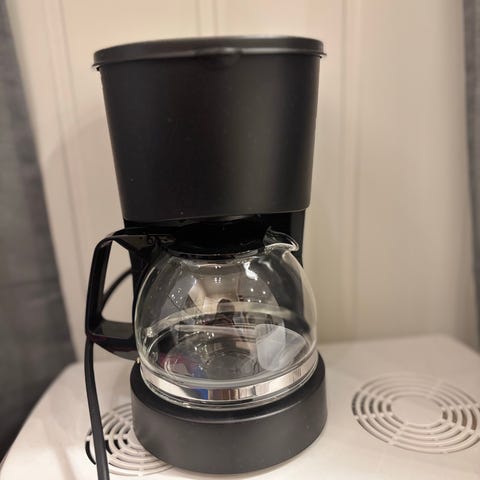 OBH Nordica King of Coffee kaffetrakter med beholder i rustfritt stål og svart plast. Kaffetrakteren har glasskanne med håndtak og et avtakbart lokk for enkel påfylling. Designet for å brygge kaffe på en praktisk måte.