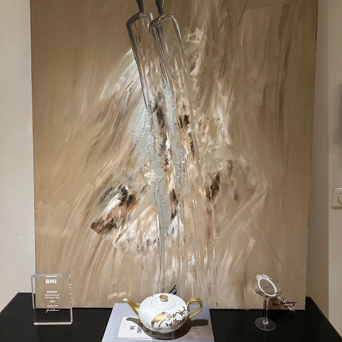Maleri med abstrakt motiv av et tre, utført i nøytrale farger. Maleriet har en teksturert overflate med mange små fargepunkter som gir dybde og detaljrikdom.