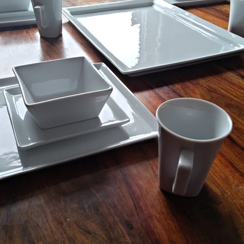Komplett servise bestående av 54 deler i hvit porselen. Inkluderer tallerkener (3 typer), skåler, kopper, serveringsfat, og m.m. Passer til daglig bruk og selskaper (6-8 personer).