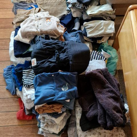 Stor klespakke selges. Str. 50-62. Passer til både gutt og jente.