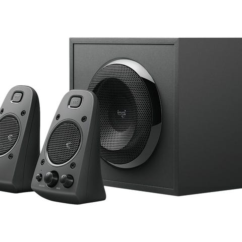 Selger et Logitech Z625 Powerful THX Sound 2.1 høyttalersett - altså: to små satellitter + en subwoofer som oppfører seg som om den har meldt seg på strongman-konkurranse.