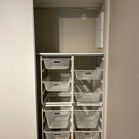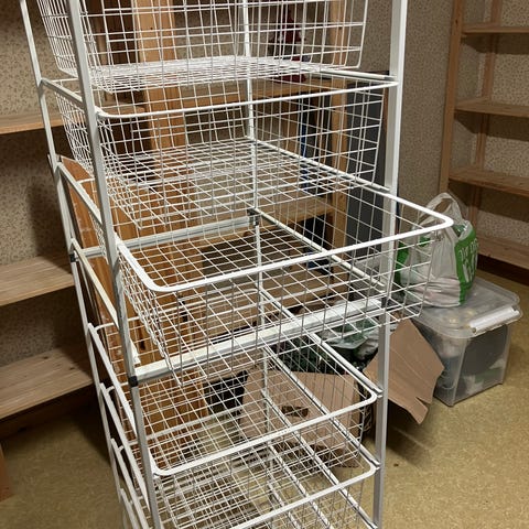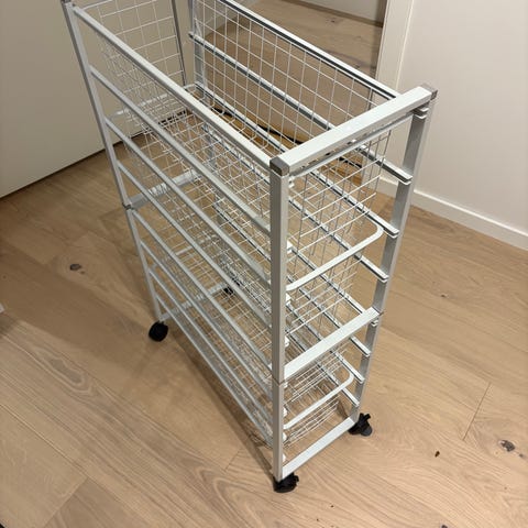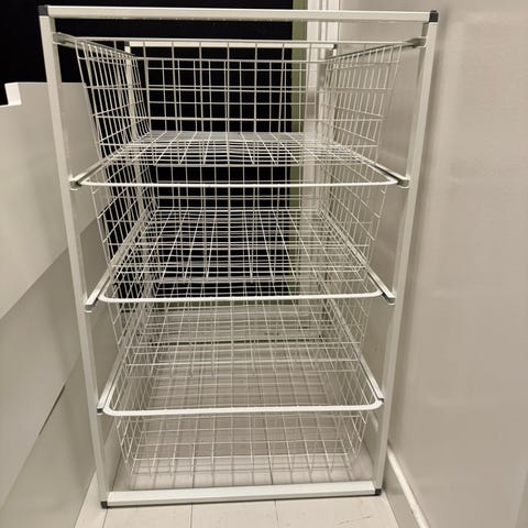 Selger to stk kurvstativ med fire skuffer. De tre nederste skuffene er like store, og den øverste er litt mindre.