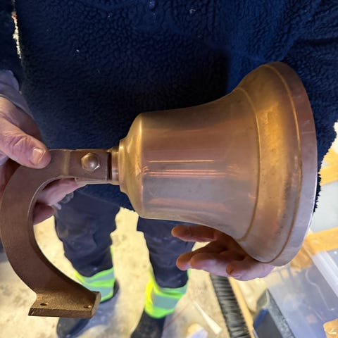 Høyde ca 14,5 cm, diameter ca 15,5cm cm. Svært høy og klar lyd. Over 2,2kg tung (1,7 uten feste)