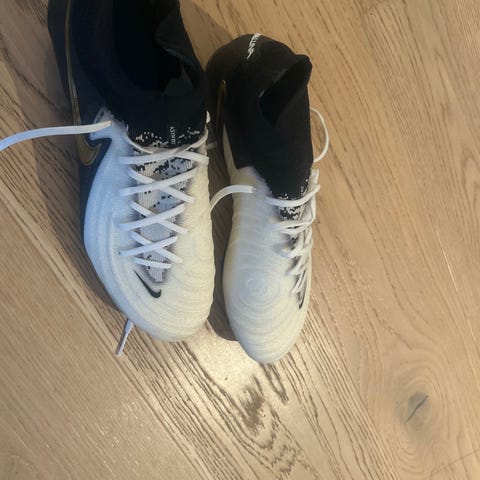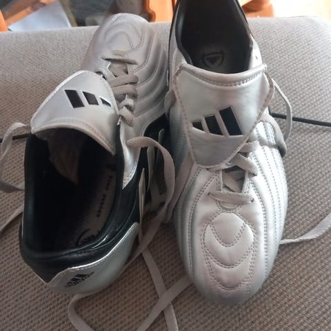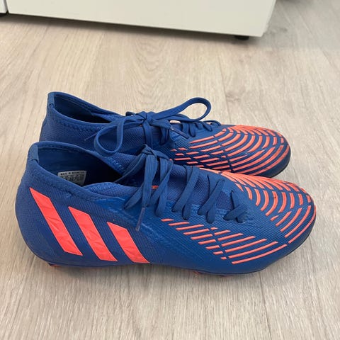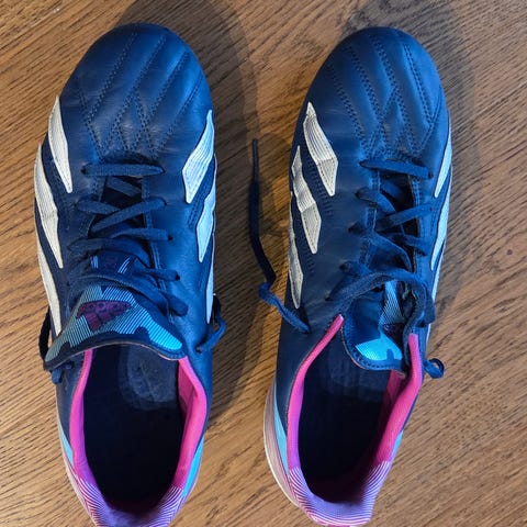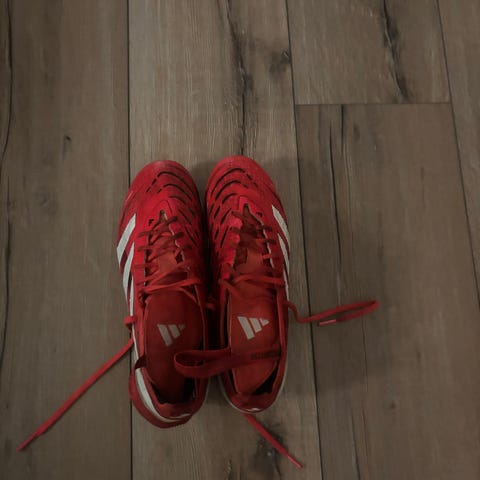 Adidas predator fotballsko i størrelse 41 1/3, farge rød med hvite detaljer. Skoene har snøring for justerbar passform og tunga som dras over og under skoen har røket på ene skoen, men den er knytt sammen slik at den er i god stand for det.