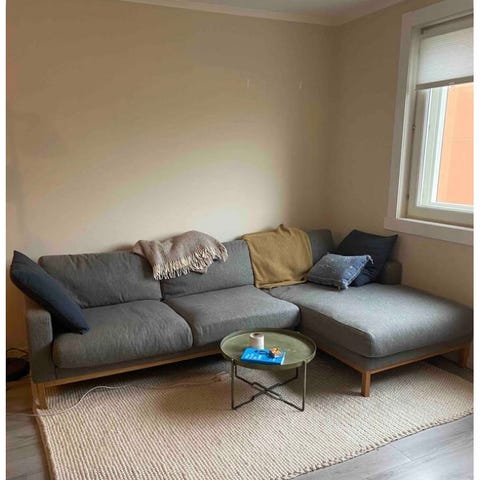 Sofaen er pen, det er noe flekker som nok kommer av med en rens med steamer, vaske trekkene eller så kan man eventuelt kjøpe nytt trekk hos bolia i den fargen man ønsker. Ellers er sofaen hel og pen.