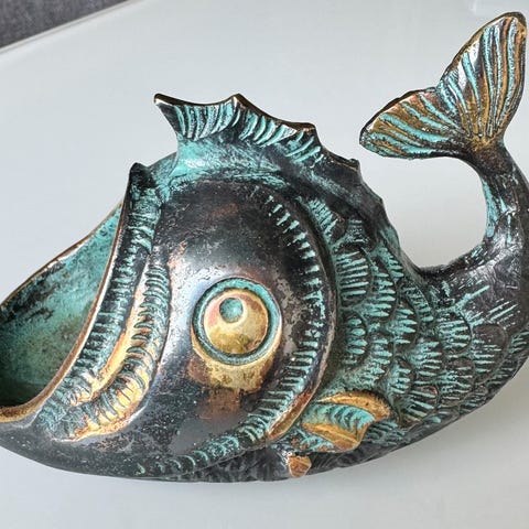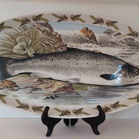 Stort Fransk vintage avlangt serveringsfat/ fiskefat/ skål i porselen med maritimt fiske motiv. Foruten at gulldekor/ gullkant er stedvis litt slitt er fatet uten skader, det har ingen skjemmende bruksmerker eller krakelert glasur. Mål ca H4,5xL58xB23 cm.