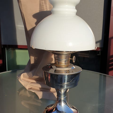 Jeg selger også en annen oljelampe i grønt glass. Se mine andre annonser eller send meg en melding om du er interessert!