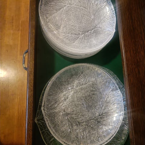 Glasstallerken med motiv. 20cm i diameter. Pent brukt. Har fem stykker. Selges samlet for 150kr.