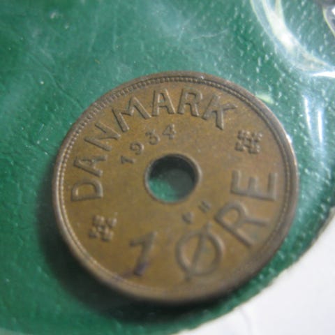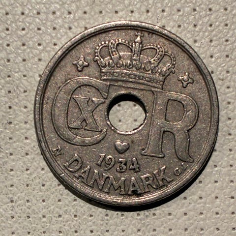 Danmark 2 Øre mynt fra 1936 med hull i midten. Mynten er laget av kobber og har kongelig monogram på forsiden.