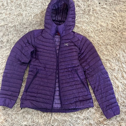 Varm og lett dunjakke fra Arc'teryx i mørkeblå med burgunder detaljer.