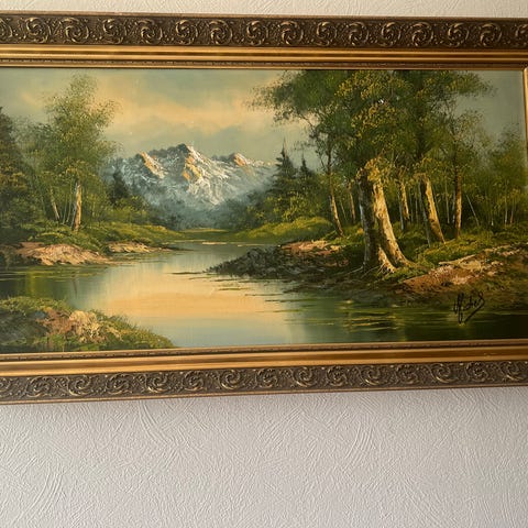 Maleri som viser et landskap med svaner ved vann, omgitt av trær i høstfarger. Maleriet er innrammet i en mørk, dekorativ ramme med detaljer langs kanten.