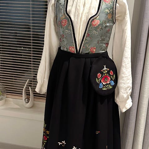 Den har tilhørt min mor. Jeg har egen bunad tilpasset meg, så jeg vurderer nå å selge denne.