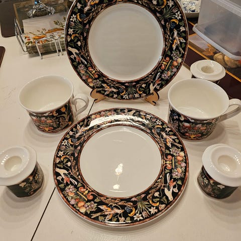 Tekanne fra Sadler med gullstaffering og blomstermotiv. Akkurat denne kombinasjonen av motiv, gull og form er typisk for 50‑tallet.