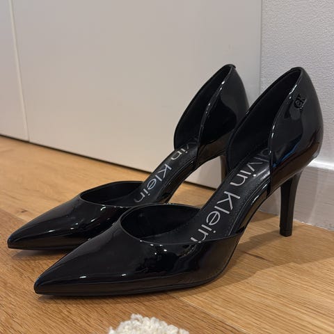 Calvin Klein Hæler i størrelse 38, beige farge. Laget i materiale med blank overflate. Brukt 2-3 ganger.