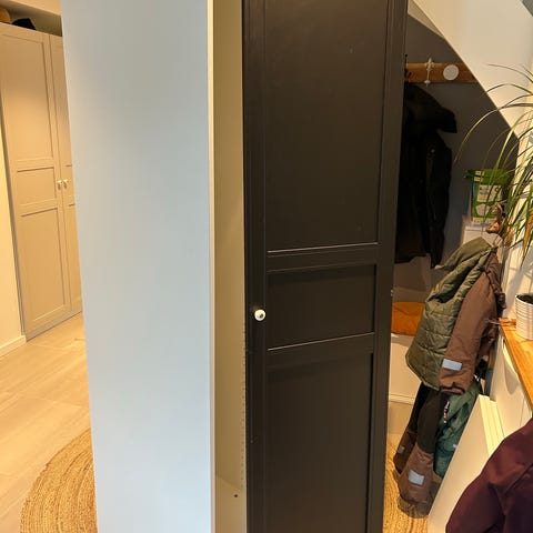 Selger et pent brukt PAX-skap fra IKEA. Skapet har ingen synlige bruksmerker/-skader verken inni og utenpå, og selges primært på grunn av ønske om å bytte ut til noe nytt. Knaggene på innsiden av døra er selvklebende og kan fjernes om ønskelig, og innredningen inni kan enkelt flyttes på eller byttes ut med annen pax-innredning fra IKEA.