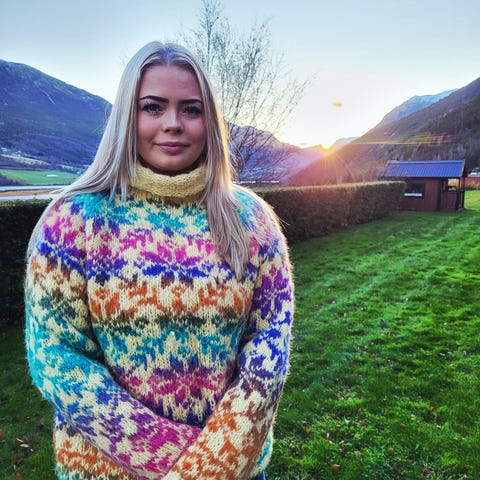 Den som strikket denne nøstet opp garnet så fargene blir mer symmetriske enn vilkårlige farger. Den er derfor finere enn orginalen. Fargene er lik illustrasjonsbilde, det er nydelige farger . Strikket i Gann Garn, en fluffy og populær genser.