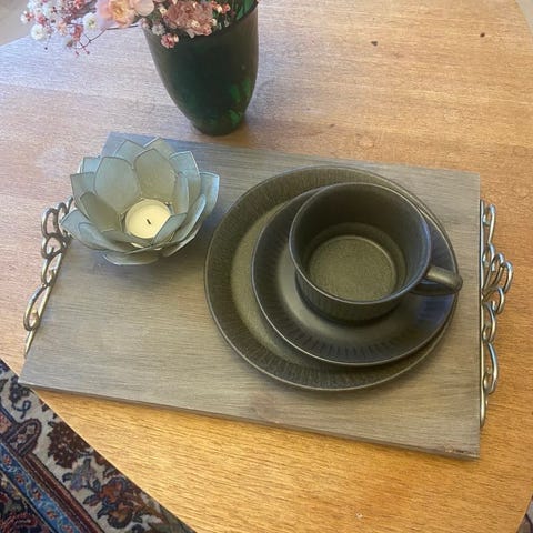 Brettet har håndtak på sidene og passer perfekt til frokost på sengen, servering, eller som dekorbrett til stearinlys og pynt.