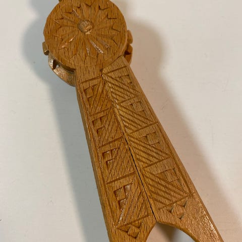 Vintage håndskåret nøtteknekker i tre – nisse med rød lue.