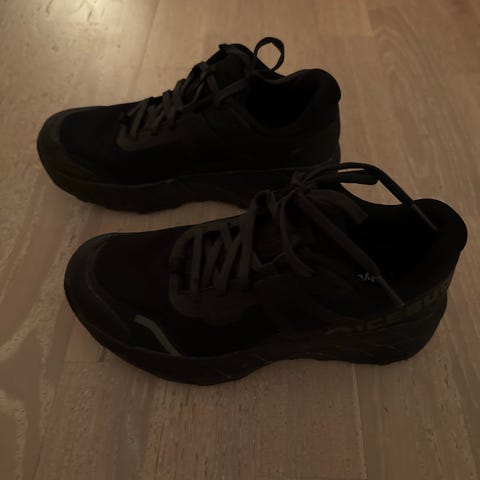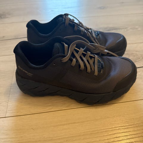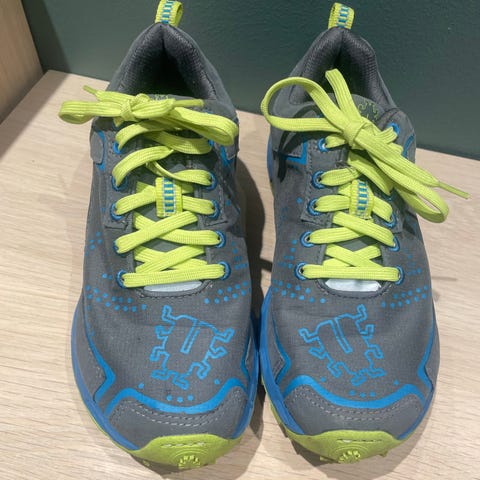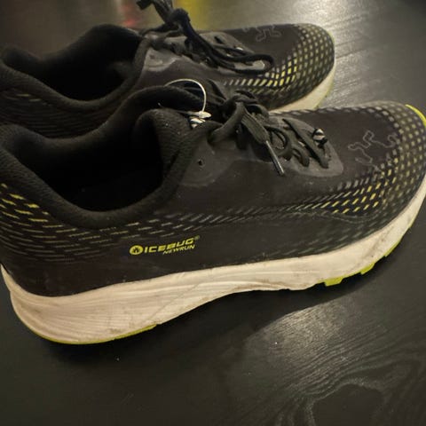 Icebug gå-/løpesko i størrelse 36, blå og grå farge. Skoene er designet for løping og har detaljer i oransje. Materialet og konstruksjonen er tilpasset for sport og utendørs bruk.