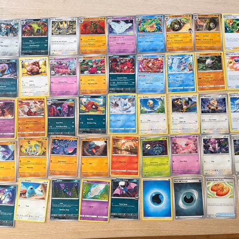 Sett med flere Pokémon samlekort i ulike farger og design. Kortene viser forskjellige Pokémon-figurer med varierende attributter og egenskaper. Egnet for samlere eller spill.