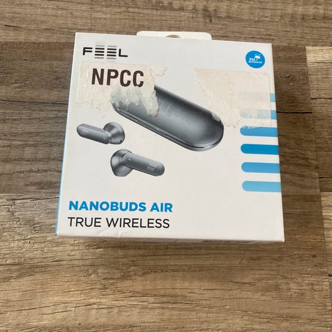 Feel Air 200 trådløst headset i hvit farge. Headsettet har et kompakt etui for lading og oppbevaring.