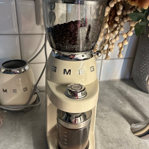 Smeg Retro kaffemaskin i grå farge. Kaffemaskinen har et retro design og kommer med tilhørende tilbehør som måleskje og vannbeholder i glass.