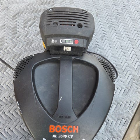 To stykker oppladbare batterier samt lader (Bosch AL 3640 CV).