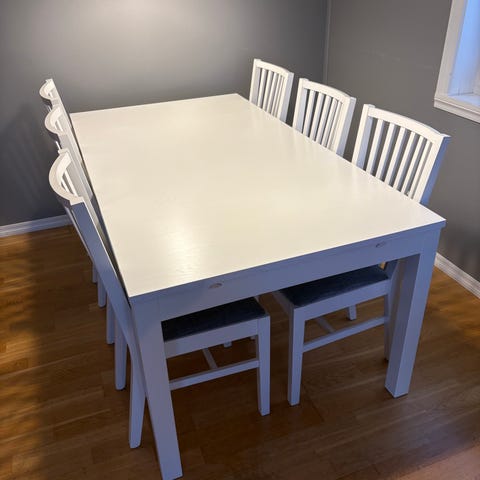 Bordet har illeggsplate som gjør spisebordet til en fin samlingsplass for mange. Hele 240 cm lang.