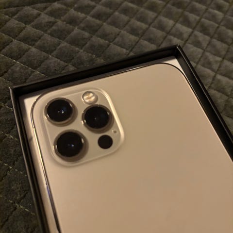 Apple iPhone 12 Pro mobiltelefon med 128 GB lagringskapasitet. Telefonen har et trippelkamera på baksiden og en skjerm med høy oppløsning. Fargen er mørk, og telefonen leveres med original emballasje.