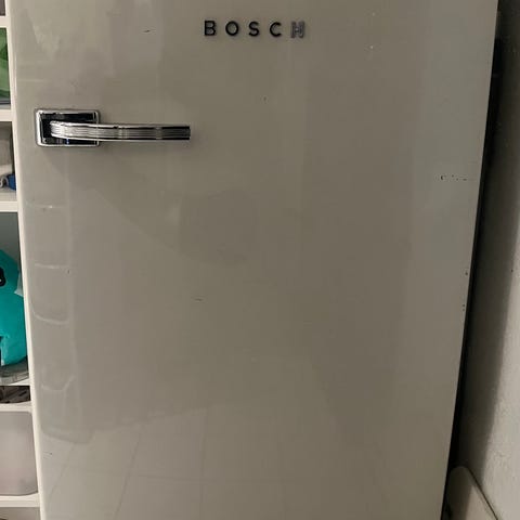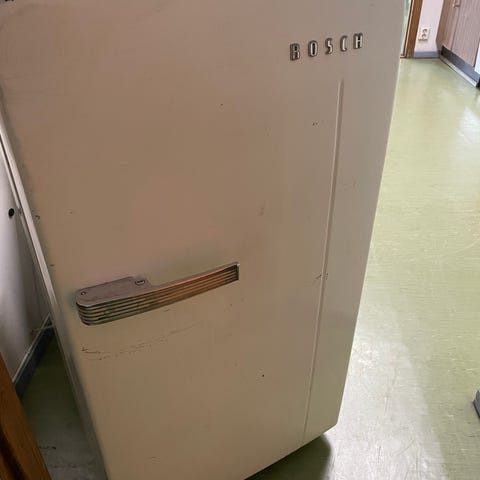 Retro Bosch kjøleskap. Tror det er fra 60-tallet. Fungerer, men ikke pent i plasten innvendig alle steder. Brukt til ekstra lagring siste årene.