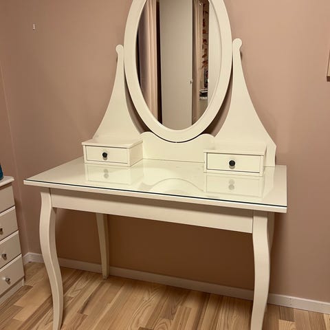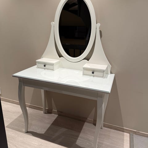 Jeg har fått et nytt sminkespeil som ikke passer til å ha på dette bordet. Derfor lurte jeg om noen ville byttet dette sminkebordet mot en annet sminkebord som ikke har noe oppå, bare selve bordet. Bordet må være 80cm eller lengre.