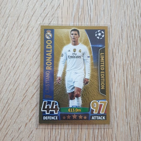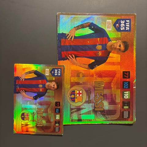 Selger to Limited Edition Lionel Messi-kort fra Panini Adrenalyn XL FIFA 365-serien. Kortene er i flott stand, helt uskadde og perfekte for samlere eller Messi-fans.