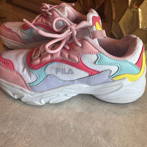 Hvite Fila joggesko/ sneakers med blå detaljer.