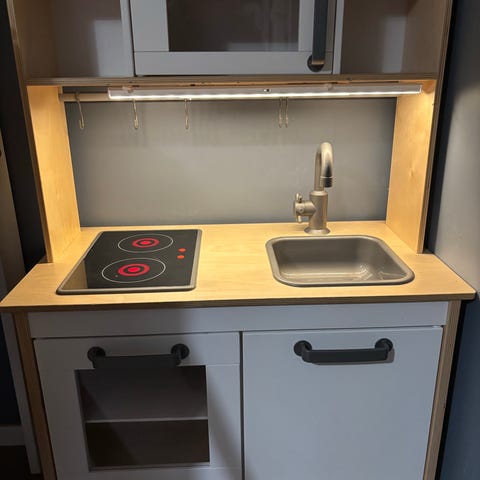IKEA DUKTIG lekekjøkken i rødt med hvit benkeplate, inkludert ovn, kokeplater, vask og oppbevaringsskap. Passer for barn til lek og læring i hjemmet.