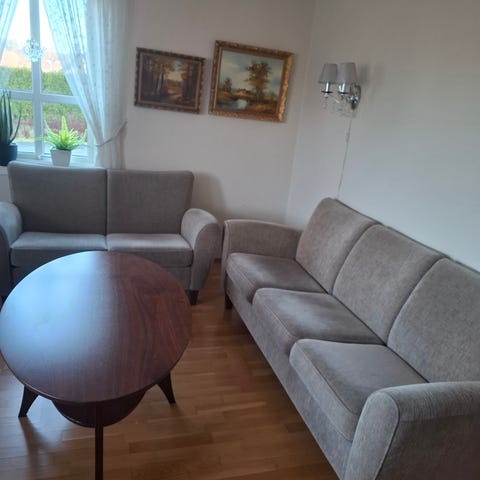 Lysebrune skinnsofaer med sofabord i eik heltre