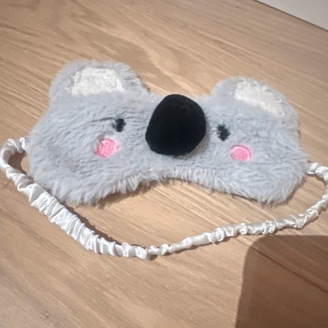 Regnbue sovemaske fra claire's med fargene lilla, blå, grønn, gul og rosa. Den er ikke synlig brukt.