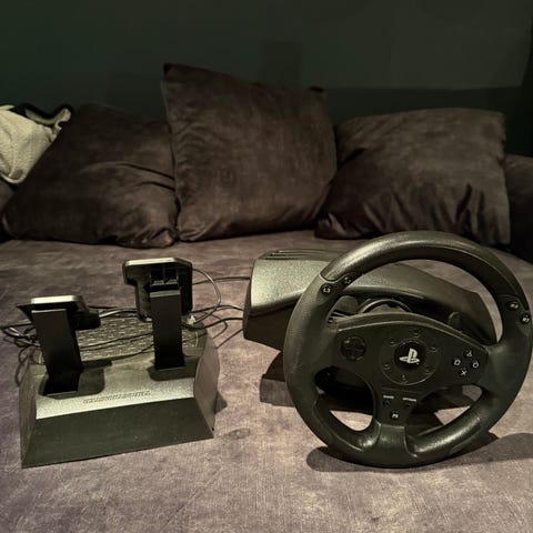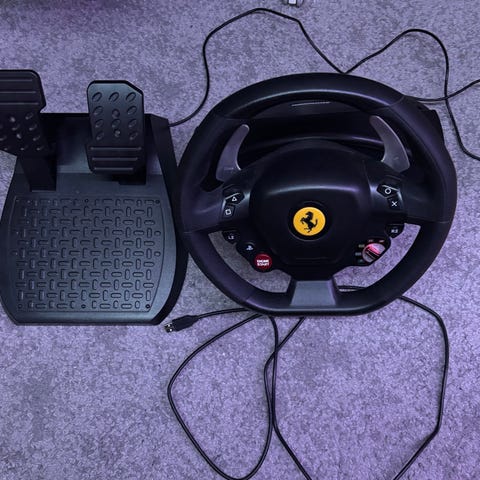 Selger et Thrustmaster ratt med Ferrari-design og tilhørende pedalsett. Perfekt for bilspill og sim-racing hjemme.