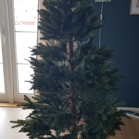 Det er ca 140 cm høyt - Helt og pent kunstig juletre selges kr 10,- Står i juletrefot, kan legges enkelt sammen.