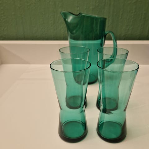 Vannmugge fra BLÅST glassverk. Munnblåst.vakker og dekorativ mugge I blått glass. Fint design. Høyde 21 cm. Åpning 9 cm. Diameter i bunnen 12 cm