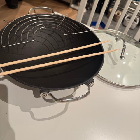 Stor Wok i støpjern med glasslokk. Wok er på hele 37 cm i diameter pluss håndtak og et glasslokk med et håndtak i metall. Pannen er egnet for matlaging. Wok pannen er tung og solid og den er lite brukt.