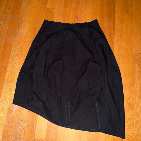 Svart skjørt med plissé. Størrelse L. Strikk i livet. Pent brukt.