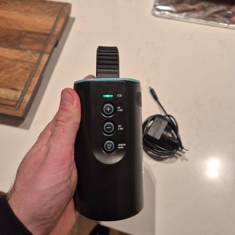 Kameraet leveres med amerikansk strømplugg. Kjøper må derfor bruke norsk USB-strømplugg med vanlig USB-A-port (ikke USB-C).