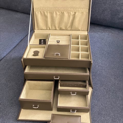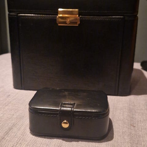 RS låsbart smykkeskrin. Grønt imitert skinn. Ubrukt.