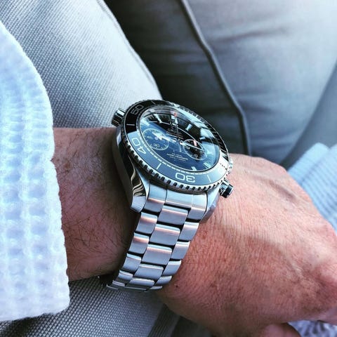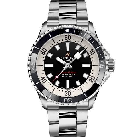 Klokken har en firkantet kasse i rustfritt stål og inkluderer kronograffunksjoner.