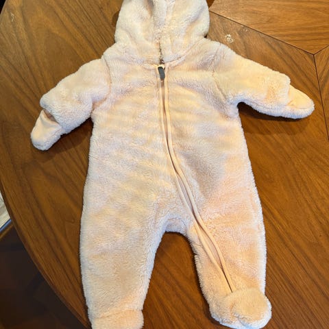 Newbie barnedress størrelse 56, farge hvit. Er laget av polyester. Har hette med små ører, glidelåsen foran og votter ved hendene/bena.