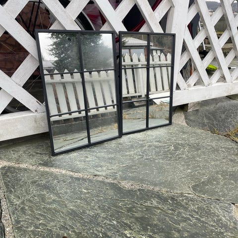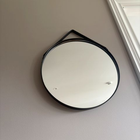 Kremmerhuset: 2 stk rundt dekorasjonsspeil med svart ramme. Speilene har en enkel og moderne design som kan brukes som veggdekorasjon i ulike rom. Selges samlet 700 kr.