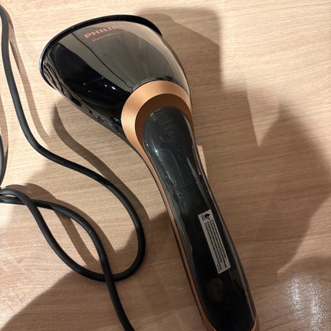 Point Steam Iron i svart farge. Elektrisk apparat for stryking med dampfunksjon. Utstyrt med strømbryter og ledning med plugg.